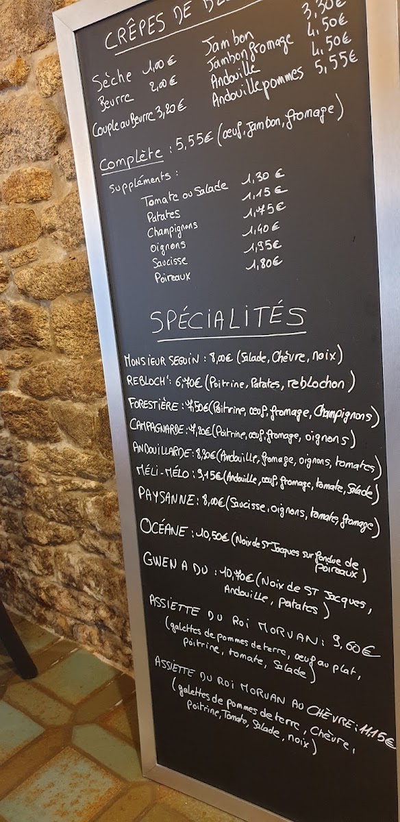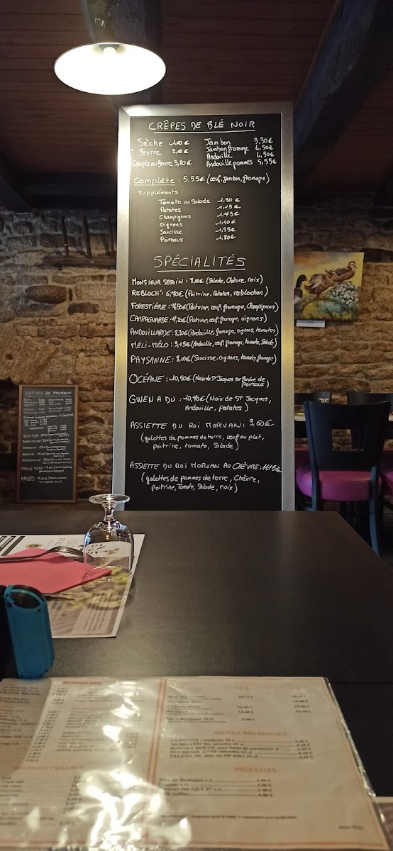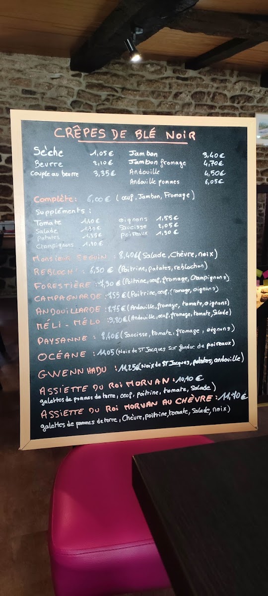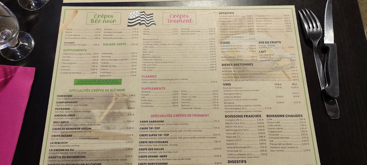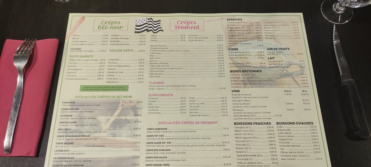 The menu at Crêperie La Sarrasine is a delightful journey through both savory and sweet French crêpe traditions, each dish crafted with care and a clear respect for local ingredients. Among the highlights, the Crêpe de Blé Noir À la Noix de Saint Jacques Et Ses Petits Poireaux stands out with its delicate balance of tender scallops and subtly sautéed leeks, offering a sophisticated taste that embodies the essence of Brittany. Sweet enthusiasts are equally spoiled, with creations like the Crêpe Aux Pommes Caramel Beurre Salé and the decadent Crêpe Super Top Top, where caramelized flavors and rich textures make every bite memorable. For those seeking variety, the Crêpe Meli- Mélo provides a playful mix of flavors, while the Crêpe Sarrasine Et Une Super Tip Top layers ingredients with inventive flair, delivering both visual and culinary appeal. The dessert offerings continue to impress, from the elegant Crêpe Chouans Et Crème Brûlée to the classic indulgence of Chocolat Liégeois, ensuring that each meal can end on a high note. Cheese lovers will appreciate the hearty Assiette Du Roi Morvan Au Chèvre Et Assiette Complète Supplément Champignons Chèvre, a robust and satisfying combination, while the flambéed Pommes Raisins Flambé Armagnac adds a dramatic touch to a sweet finish. Overall, the menu at Crêperie La Sarrasine is thoughtfully curated, offering a harmonious mix of traditional and inventive crêpes that cater to every palate, making it a must-visit for anyone seeking a memorable culinary experience in Le Faouët.